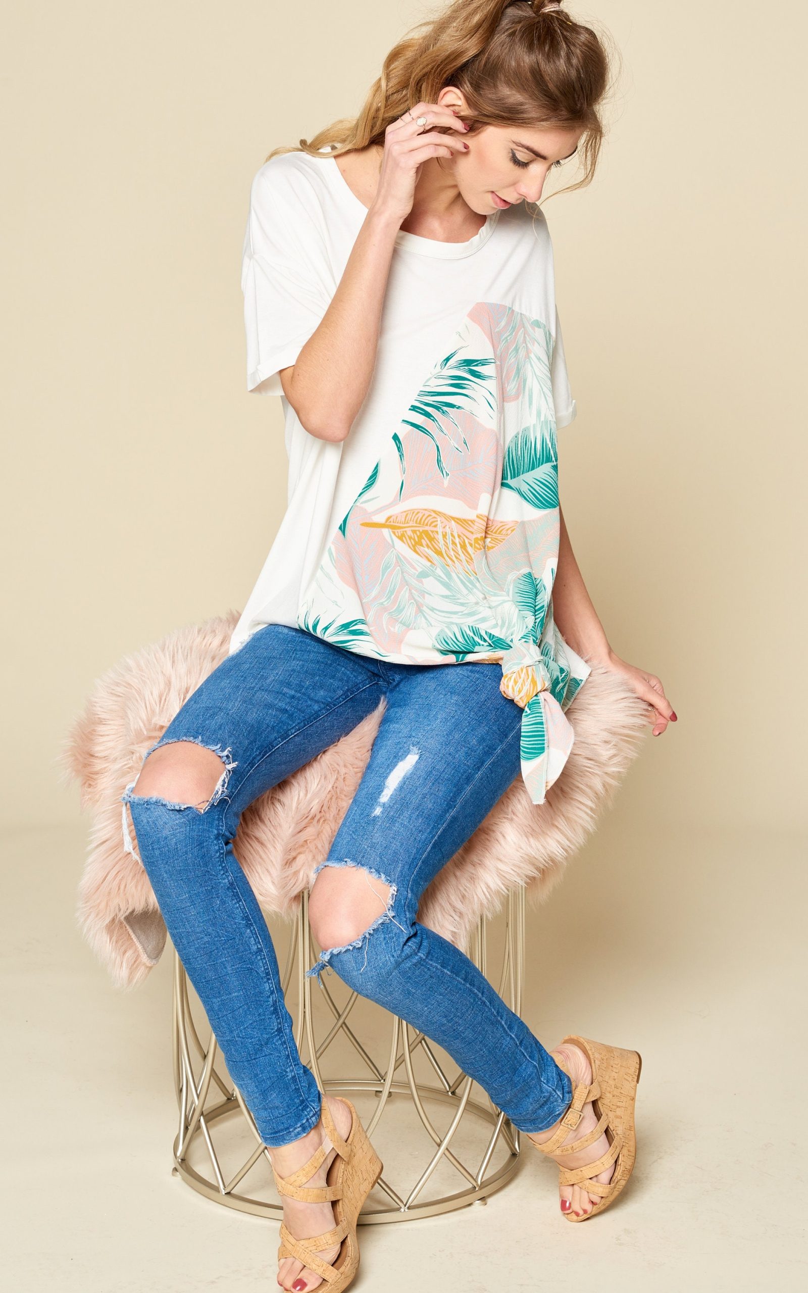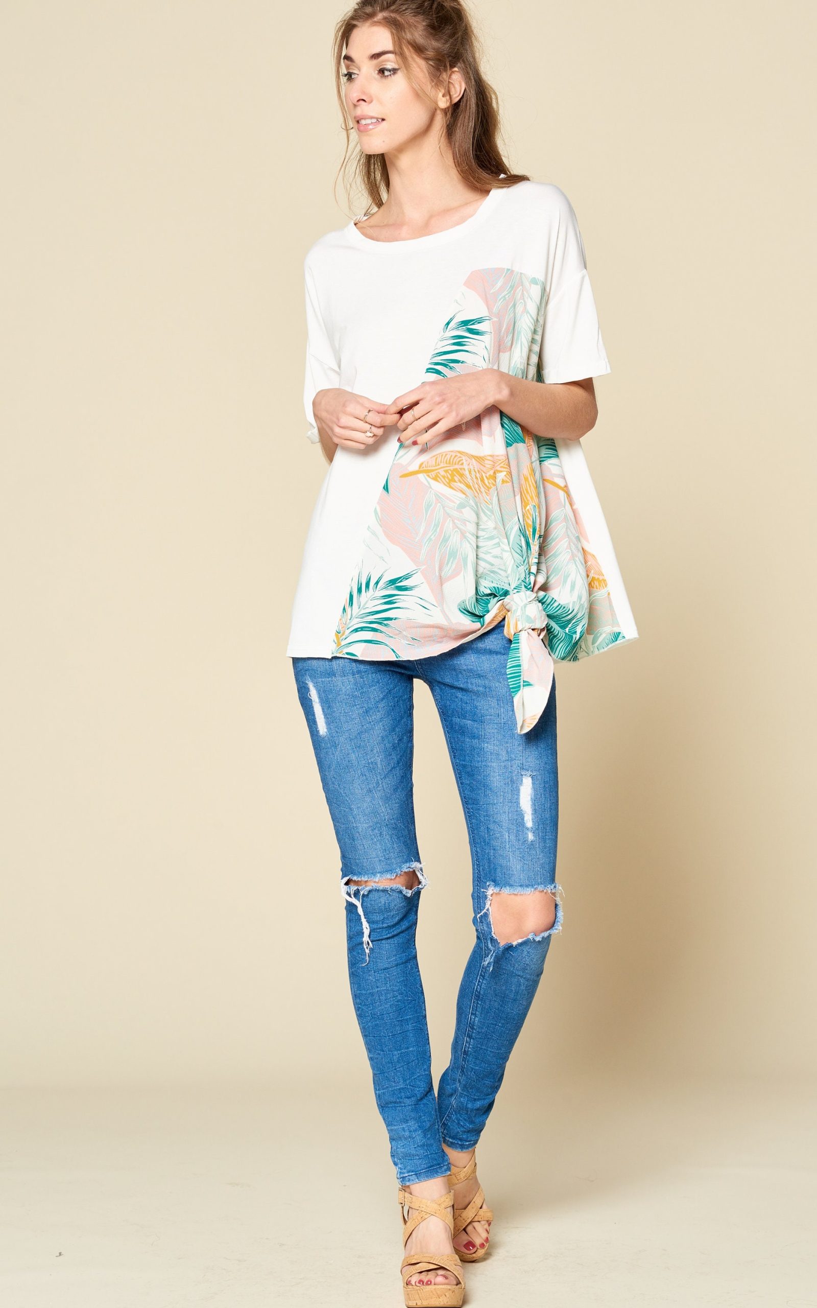 Comfy oversized short sleeved top featured with bubble fabric, tropical print, and side tie details.