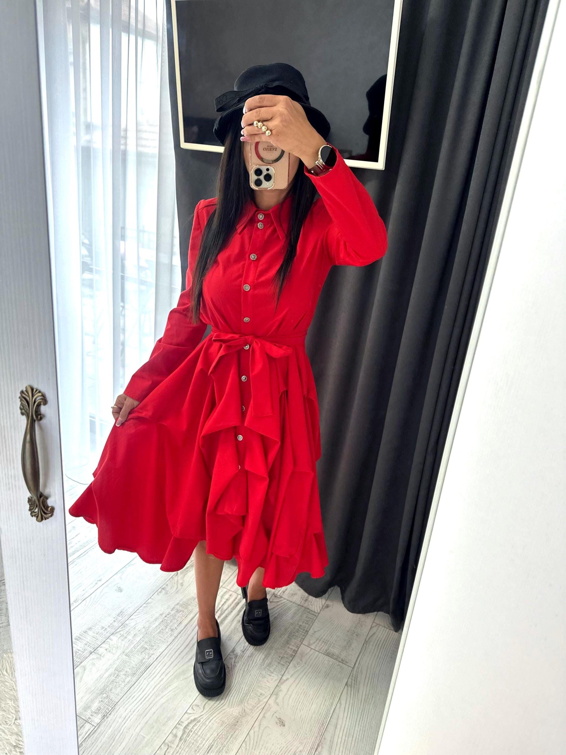 Make a bold yet effortless statement with this red flared shirt dress the perfect combination of comfort and timeless style.