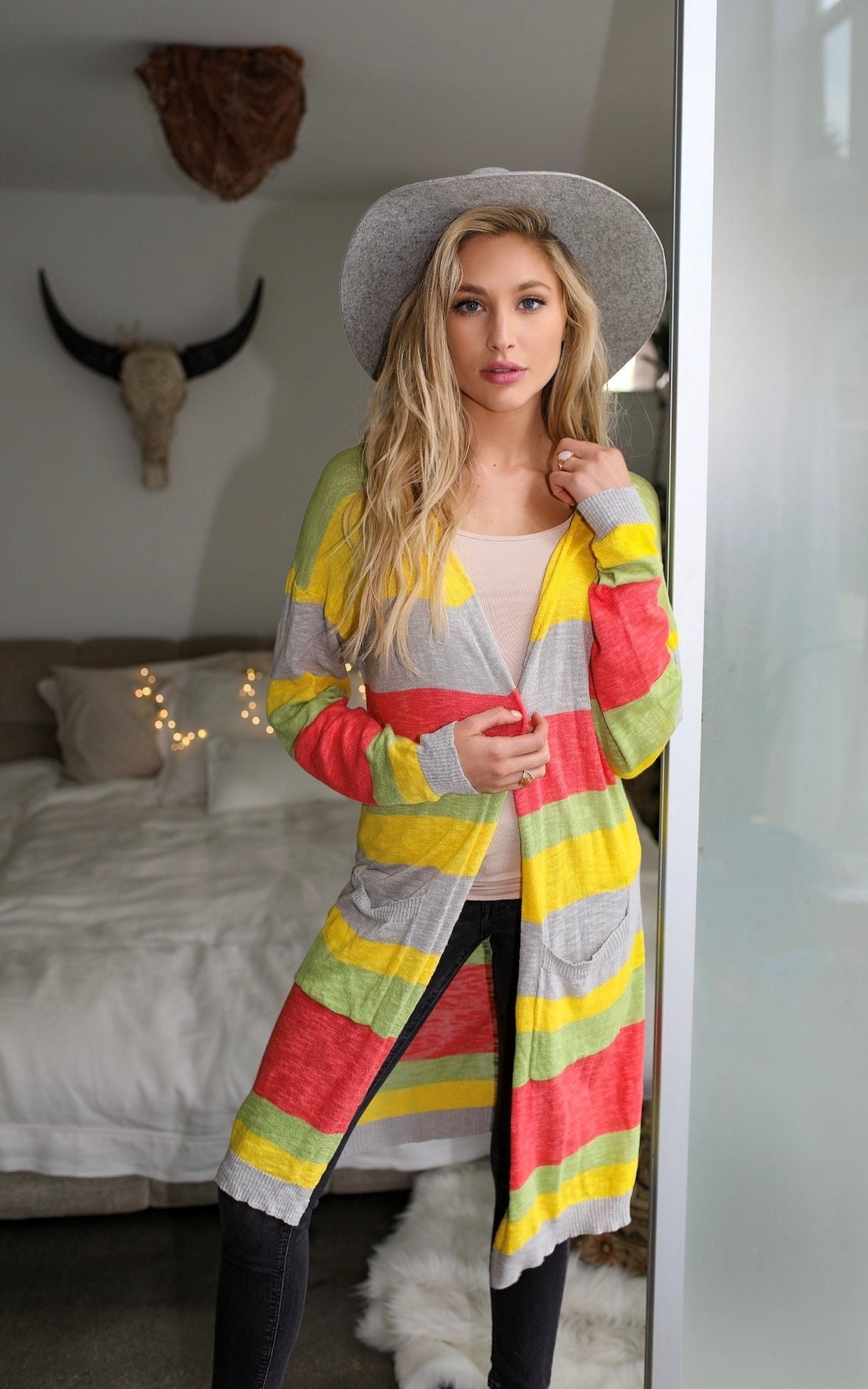 Lightweighted open-front cardigan in a vibrant, pop colored stripes.